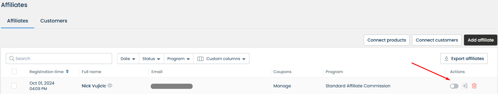 4. **Deactivate affiliate:** If an affiliate is approved, you can temporarily suspend them by going to Affiliates > switch off the toggle on the **Actions** column. All sales will no longer be tracked for the affiliates. If you want to activate the affiliate again, switch on the toggle.&#x20;