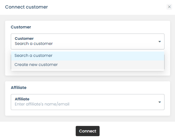 To connect a customer to an affiliate, go to **Affiliates** > **Connect customers**.  Next, you can choose to search for an existing customer or add a new customer.