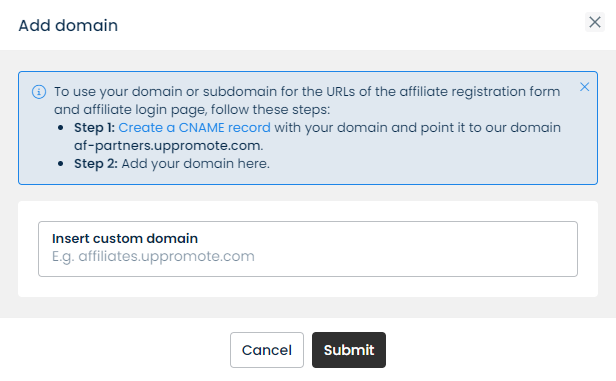 Go to the UpPromote account Home tab > Custom domain button, you will then see the Add domain popup.