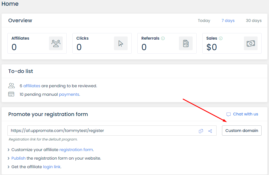 If you want to have a custom domain for the affiliate login page, affiliate registration form link, or network link instead of the ones that start with af.uppromote.com, you can follow this instruction to change it.