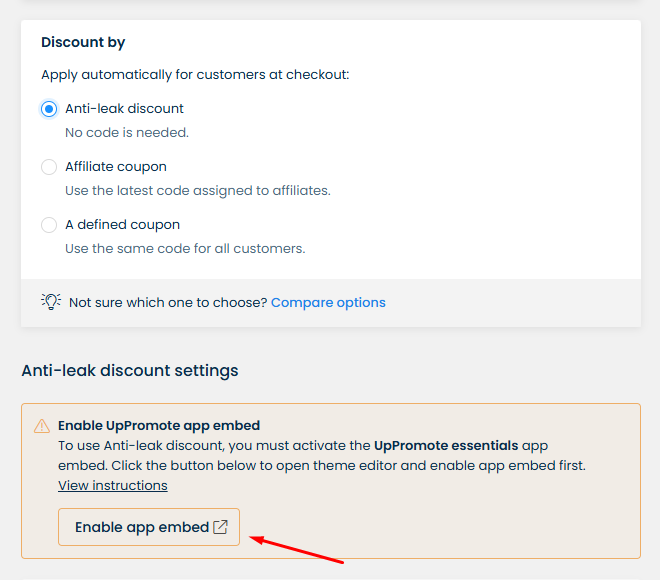 * Anti-leak discount requires the **UpPromote essentials app embed** to be enabled. If the app embed is disabled, the Anti-leak discount will be automatically deactivated.