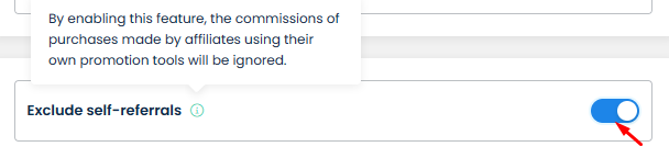 Commonly, merchants don't want to give commissions to affiliates when they make the orders themselves due to concerns over costs, profit maximization, fraud prevention, tracking accuracy, and maintaining fairness within the affiliate program. In such cases, you can make use of our feature **Exclude self-referrals**. By turning it on for a program, all affiliates in it will no longer get commissions for **Self-referrals**. Such orders will not even show up in **UpPromote > Referrals** like regular referrals.
