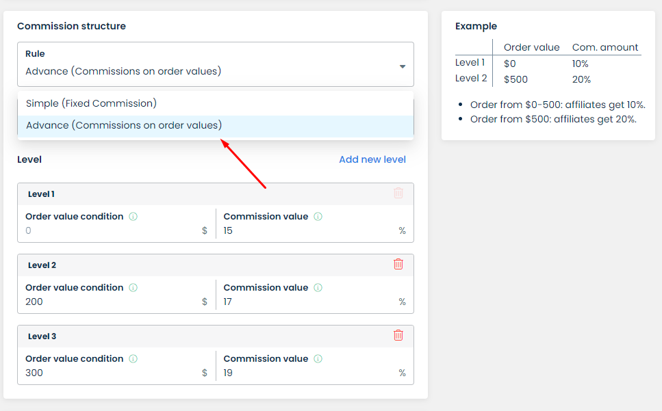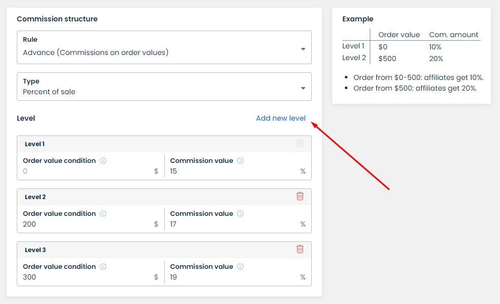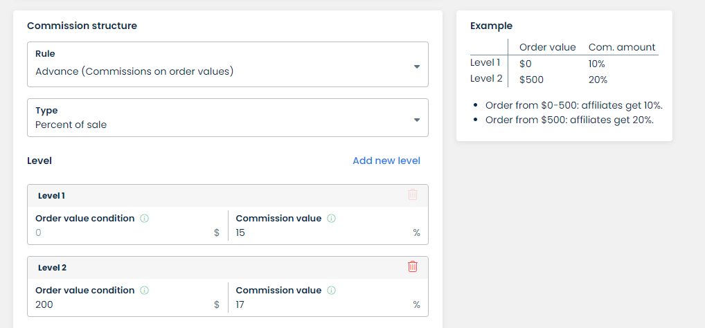 Next, add more level(s) of commission rate by clicking **Add new level**. From there, you can set the *minimum order value* and *commission rate* for each level.