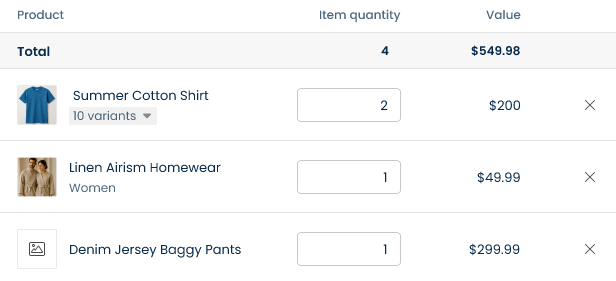 After that, you can enter the **item quantity** for each product in the gift. As shown in the example below, the affiliate can receive two *Summer Cotton Shirt* items and choose their preferred variant for each one. For the *Linen Airism Homewear*, the affiliate can only receive one item, limited to the *Women* variant.