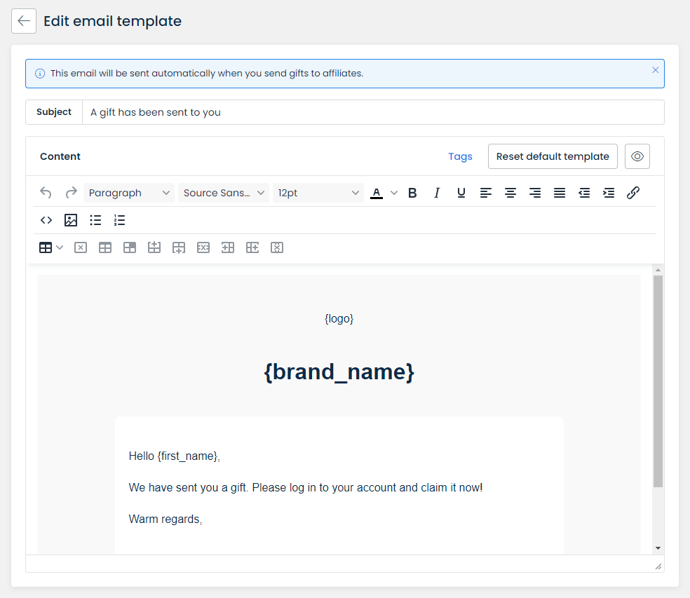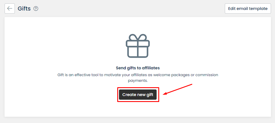 When gifts are sent successfully to affiliates, they will automatically receive an email telling them that there's a gift for them to claim. You can always edit the template of that email to suit your business's strategy in the **Edit email template.**
