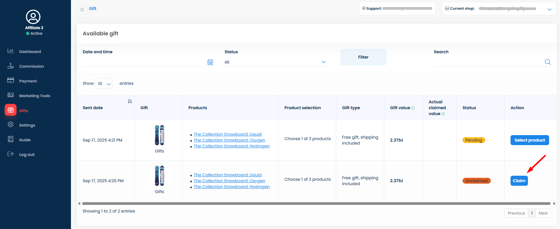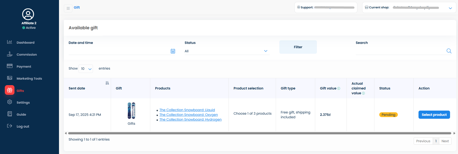 The sent gift will be shown on the **Available gift** list for affiliates to review and claim. Affiliates can also check for the products they are about to receive by clicking directly on the product's name. Then, click the **Select product** button to claim the gift.