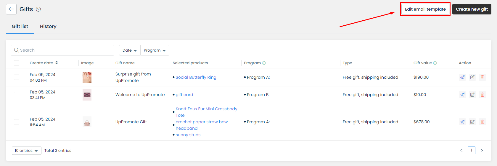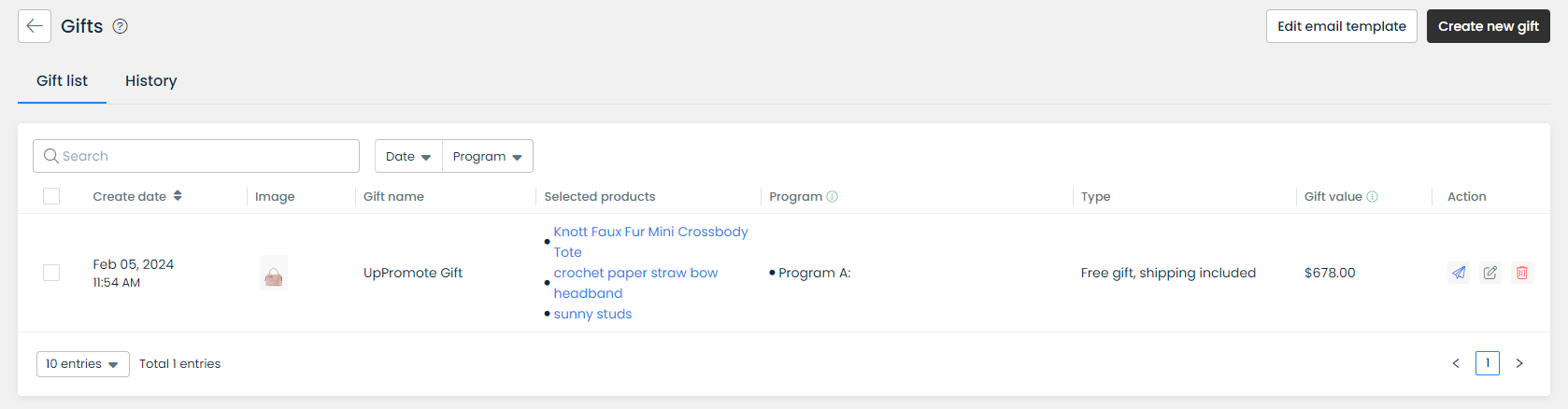 On the **Gift list** page, you can view all the available gifts of your affiliate program with the necessary information, edit them, or send gifts manually (the plane icon) to specific affiliates (both auto-gifts and manual gifts can be sent manually).&#x20;