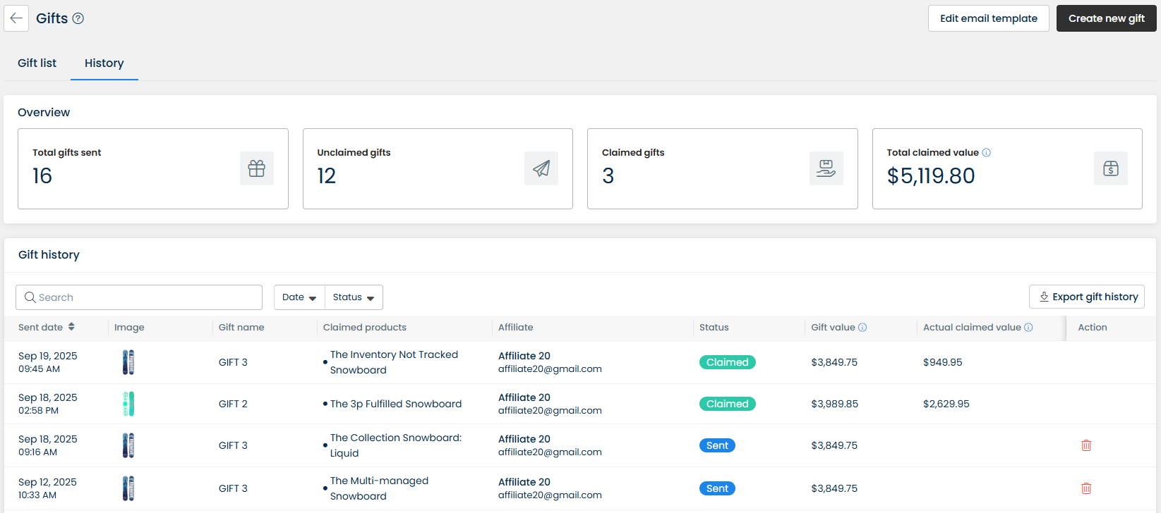 For both auto-gifts and manual gifts, after sending them successfully, you'll be able to review the status of these sent gifts in the **History** tab as well as check for their brief report to know if affiliates have claimed them or not.