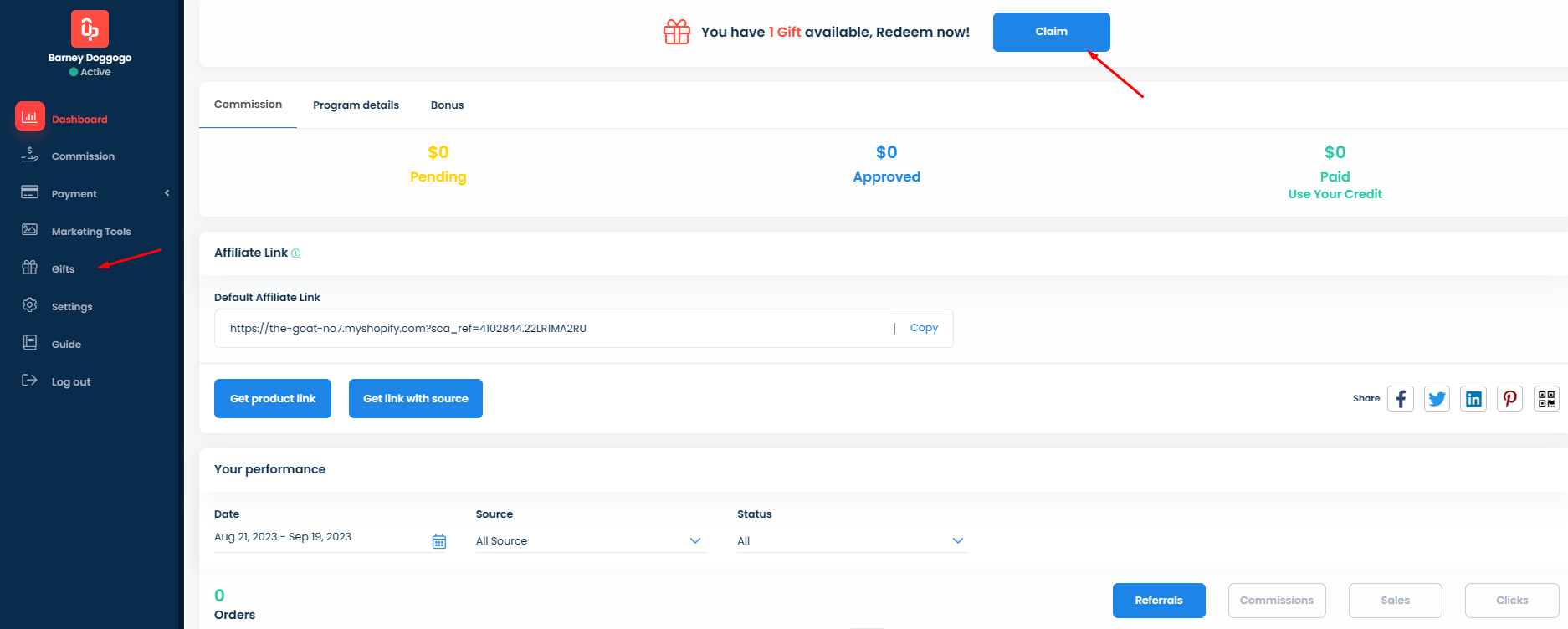 When gifts are sent successfully to affiliates, they will be notified about it right on their **Dashboard**. Clicking on the **Claim** button will then redirect them to the **Gifts** tab so they can redeem the gift.&#x20;