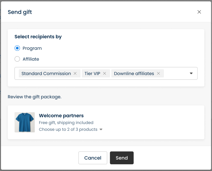 If you choose to send a gift manually, a **Send gift** popup will be shown on the screen. You can choose to send the selected gift to specific programs or to certain affiliates. Kindly then click **Send gift** to send it manually to these affiliates.
