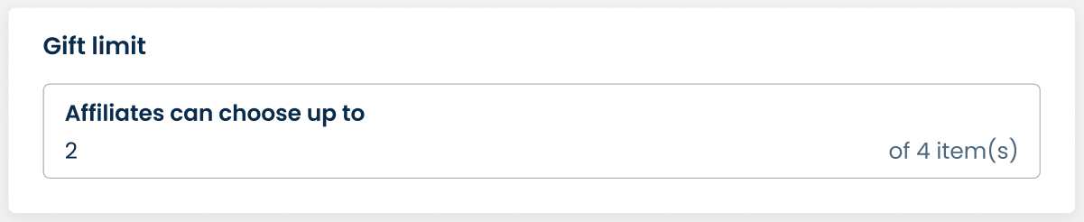 Finally, set the **number of items that affiliates can choose** when claiming this gift. For example, if you select 4 items for the gift but affiliates can only choose up to 2 of 4 items given, kindly insert 2 in this field.