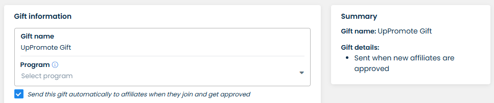Firstly, please input the **Gift name** for this gift package to label it. If you consider sending gifts automatically to affiliates when they join your program, please check the box and choose the **program(s)** that you would like to deliver gifts to affiliates who register for these programs.&#x20;