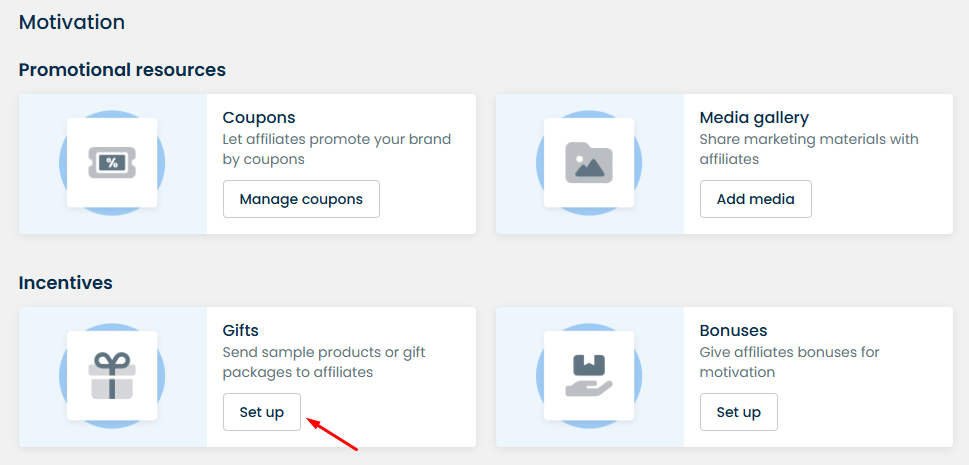 Gifts are free or discounted products that you can send to affiliates as a welcome package when they join the program or as a bonus when they perform well.
