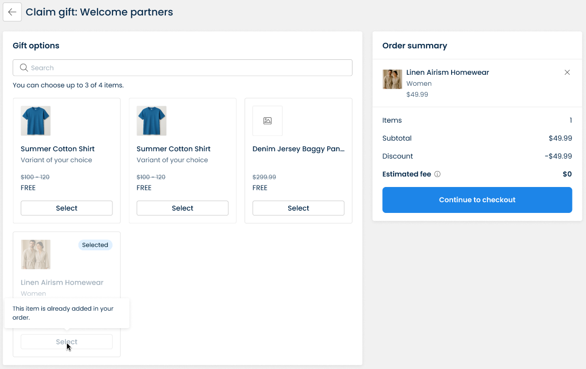 A **Claim gift** page will appear on the screen. In this example, affiliates can choose up to 3 of 4 items.