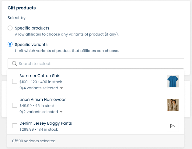 Please **select products** for the gift by searching for the product name in the search bar and adding it to the package. In this section, you can select specific product variants and allow affiliates to choose their preferred one when receiving the gift.