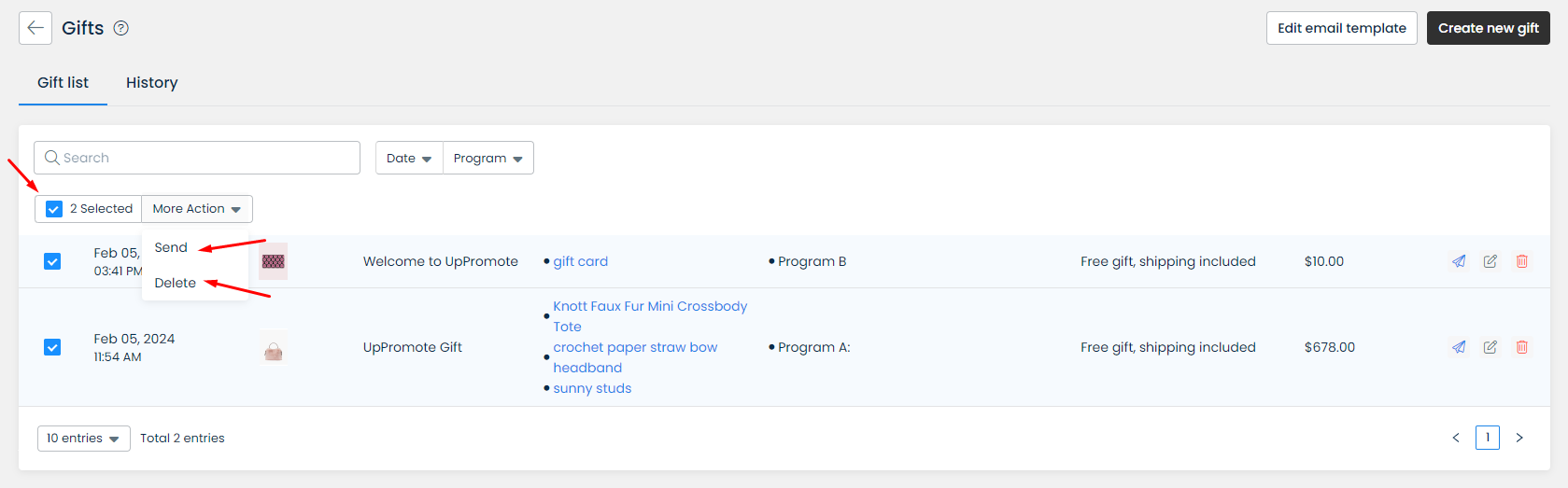 In case you want to send/delete multiple gifts at a time, kindly check the boxes of these gifts and click on this bulk option.&#x20;