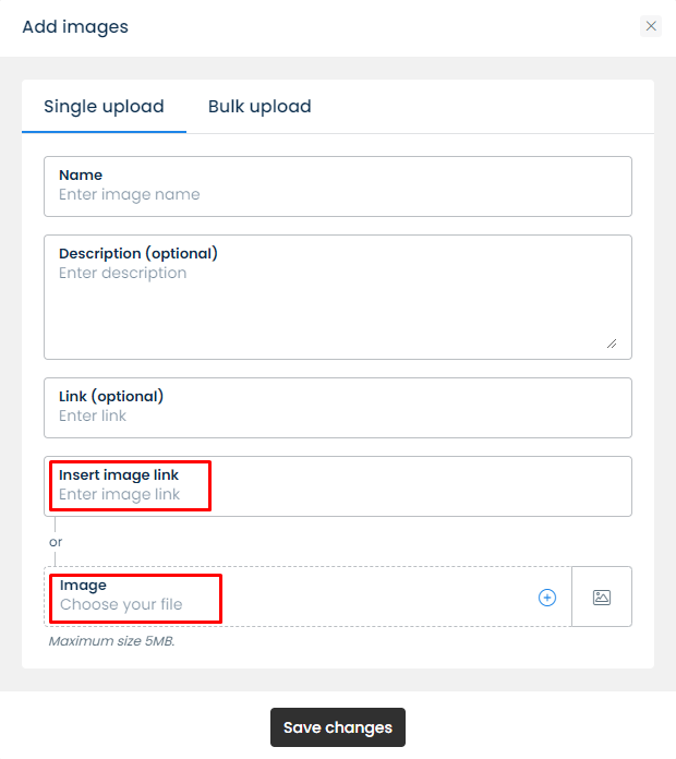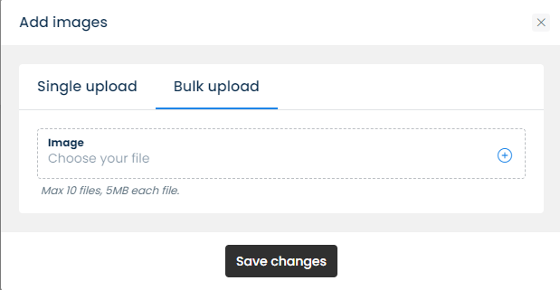 When clicking **Add media** > Add images/files > **Bulk upload**, you can select up to 10 files at a time, each file cannot exceed 5MB. The file names will be the names on your computer, you can then edit the names, descriptions, links, etc. after the bulk upload.