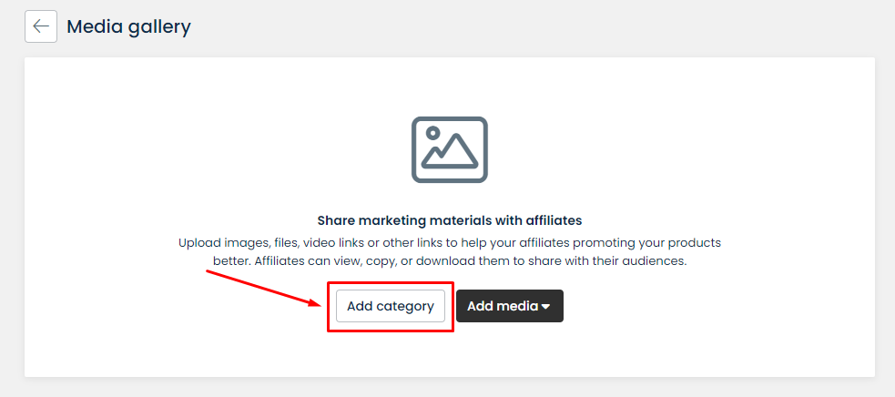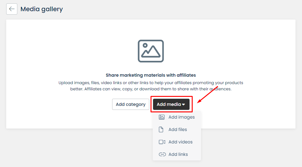 With **Media Gallery**, you can upload unlimited images, links, video links, or other files which will help your affiliates to promote your business. Each file must be **smaller than 5MB.**