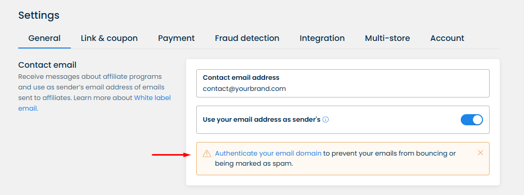 However, you can use your email address as the sender's email and receive any replies from affiliates by going to **Settings > General >** enable **Use your email address as sender's**: