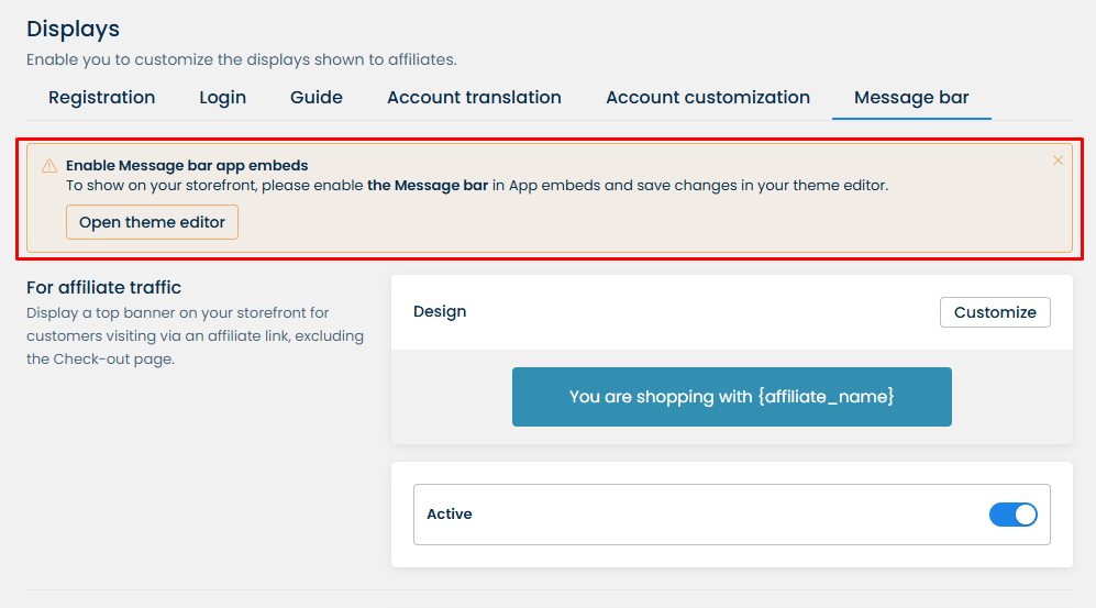 Moreover, you have the option to show a message to your customers if they **DON'T** access your store through an affiliate link. This section helps you remind your visitors to access the site through a referral link (it's especially effective when you work with a non-profit organization):