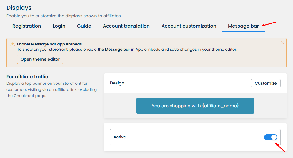 **Note:** After saving changes of the Message bar or when you publish a new theme for your store, please click on the link provided on the right banner of the **Message bar settings** page to **enable** the function on your Shopify theme, then click **Save** to show the Message bar widget on your website.