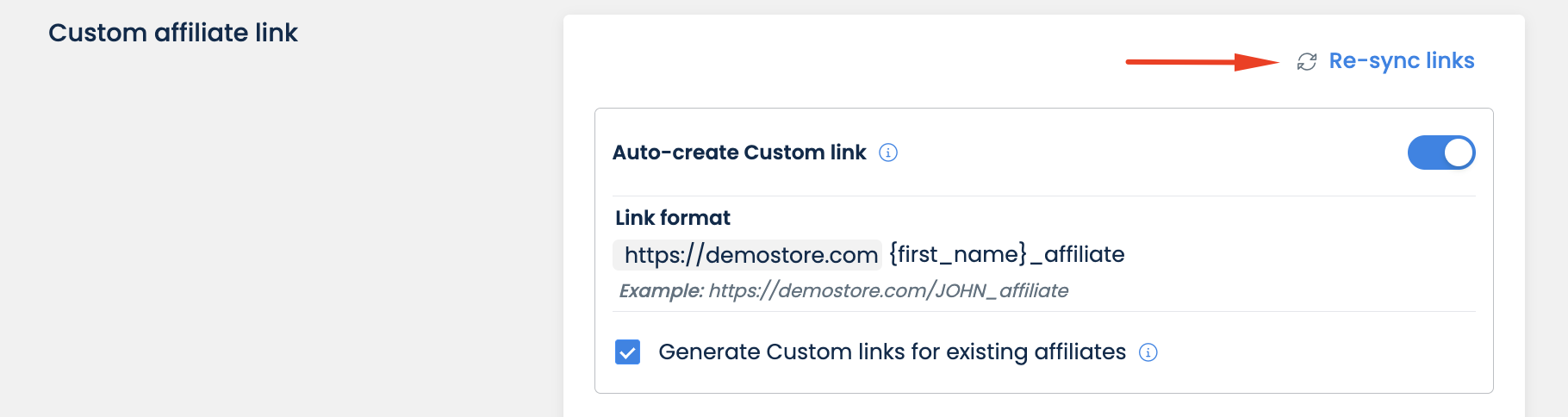 In that case, you can click the **Re-sync links** button in the Custom affiliate link settings to update all custom links to follow the latest Affiliate link. We will inform you via the Notification center when the Re-sync process is done.&#x20;