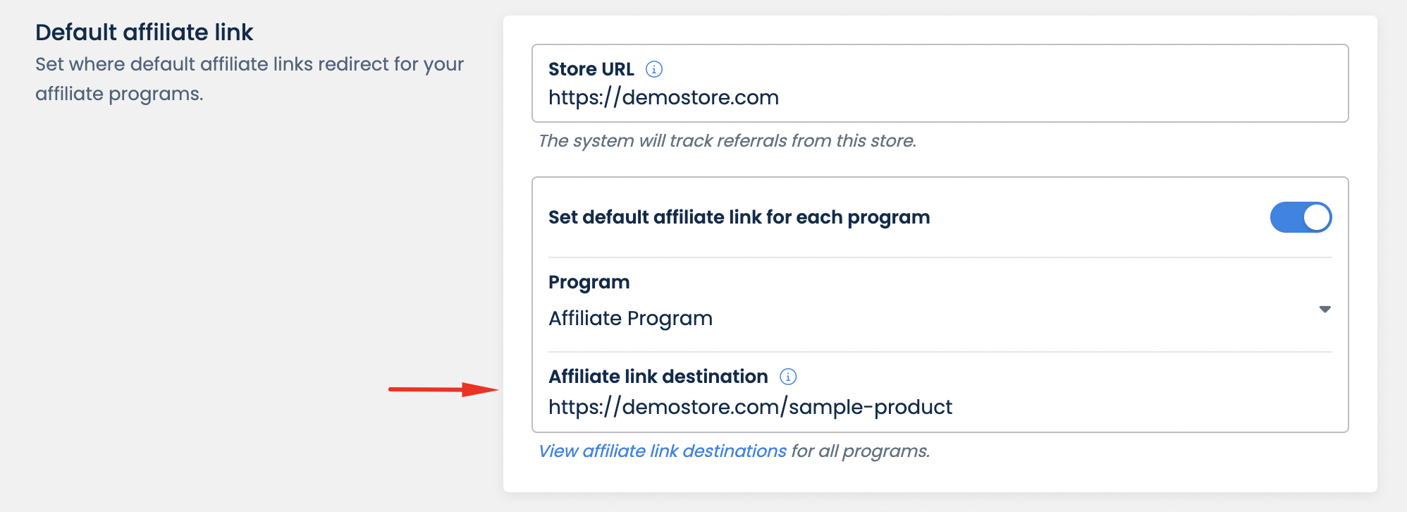 For example, if you want all affiliate links of one program to head to a specific product page, put the URL of that product page into the **Affiliate link destination** field.&#x20;