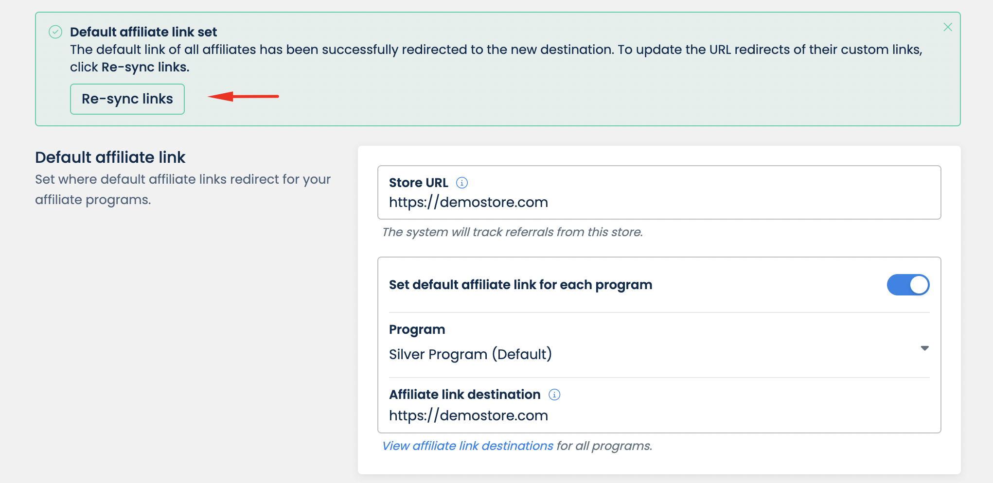 If you've had custom affiliate links and are in the Professional plan or above (or subscribing to the Feature add-on plan), when you change the affiliate link destination, the link redirects won't be automatically updated. Instead, after saving changes, you will see a green banner including the **Re-sync links** button that you can click on to update the program's custom links to the correct destination.