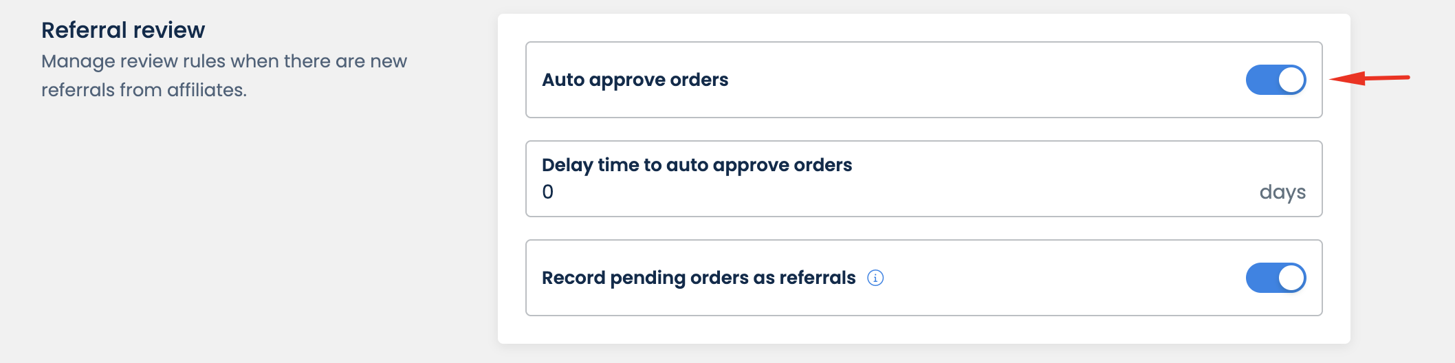 Manually reviewing and approving each referral might be very time-consuming, especially when you have a good affiliate team that brings in referrals regularly.  By turning on **Auto approve orders**, all newly tracked referrals will be approved automatically without waiting for you to review.