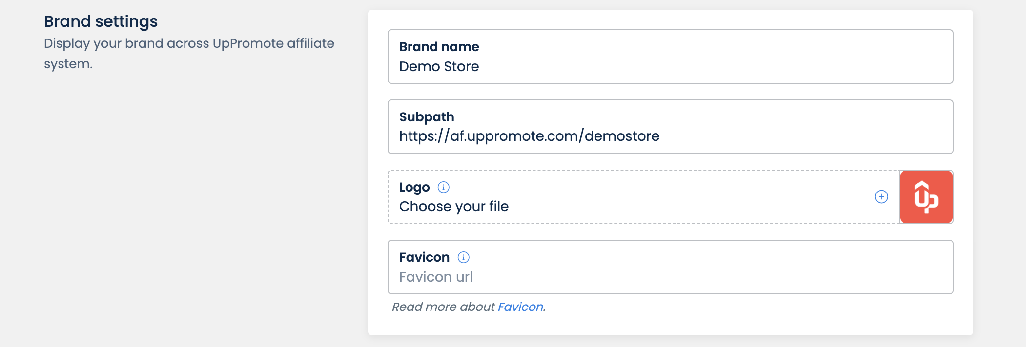 Your brand logo will be displayed on the [registration form](https://docs.uppromote.com/management/affiliate-registration-form), [affiliate admin](https://docs.uppromote.com/guide-for-affiliate/affiliate-admin) and in automatic emails sent to affiliates.