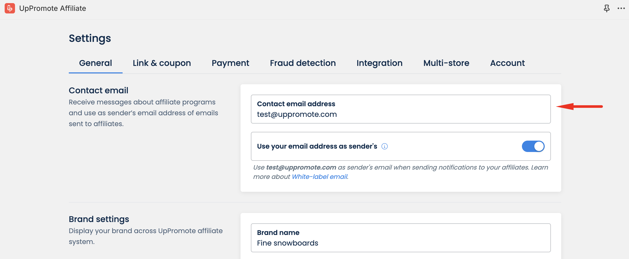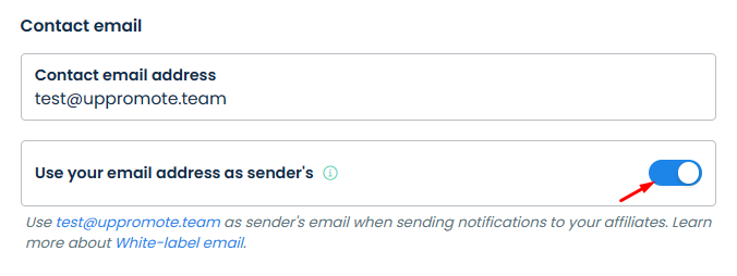 Contact email can be used as the sender's email address of the automatic emails sent to your affiliates. To set that up, enter your email address into Contact email address box, then enable Use your email address as sender's and click Save.