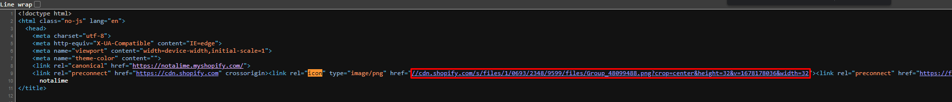 Next, press **Ctrl + F** and type ***icon**.* You will see your favicon URL next to it.