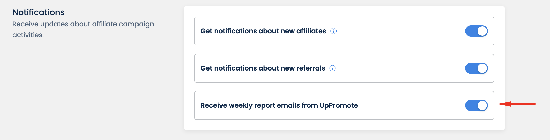 To get the weekly email, you need to enable the notification on **Settings** > **General** > **Notifications** > **Receive weekly report emails from UpPromote.**