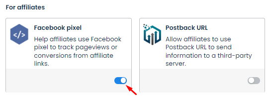 <mark style="color:blue;">**Facebook pixel**</mark> helps affiliates embed their Facebook pixel IDs on your store to track pageview/conversion from their affiliate links. To enable this integration, go to **Settings** > **Integration** > **Facebook pixel** > switch it on.