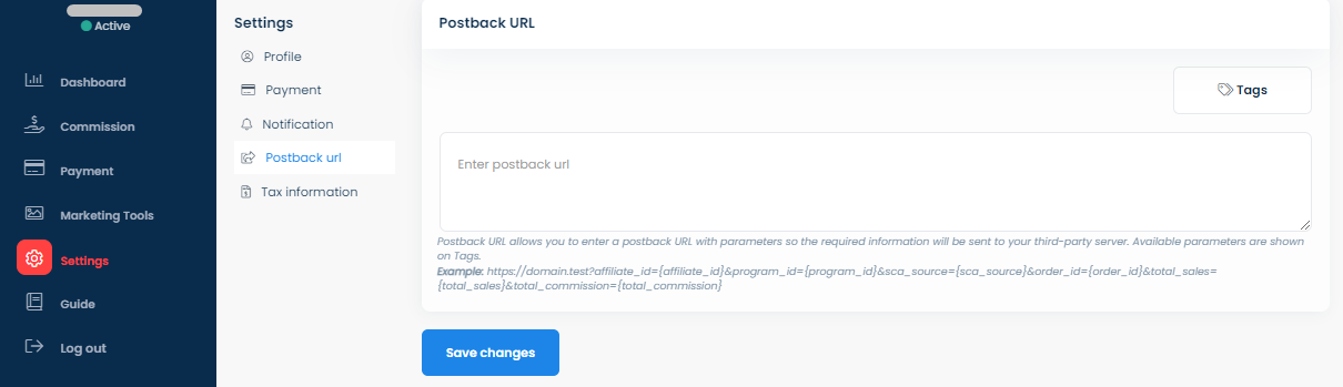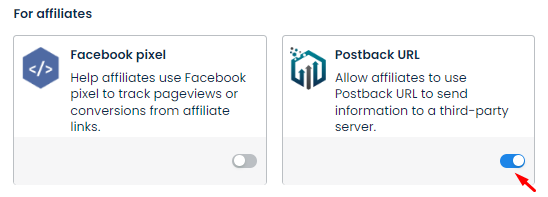 Enabling **Postback URL** allows your affiliates to enter their postback URL with **parameters** so the required information will be sent to their **third-party server**.