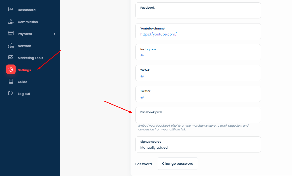 After you enable <mark style="color:blue;">**Facebook pixel**</mark>, there will be a field called **Facebook pixel** for affiliates to enter their pixel ID on the affiliate account page: