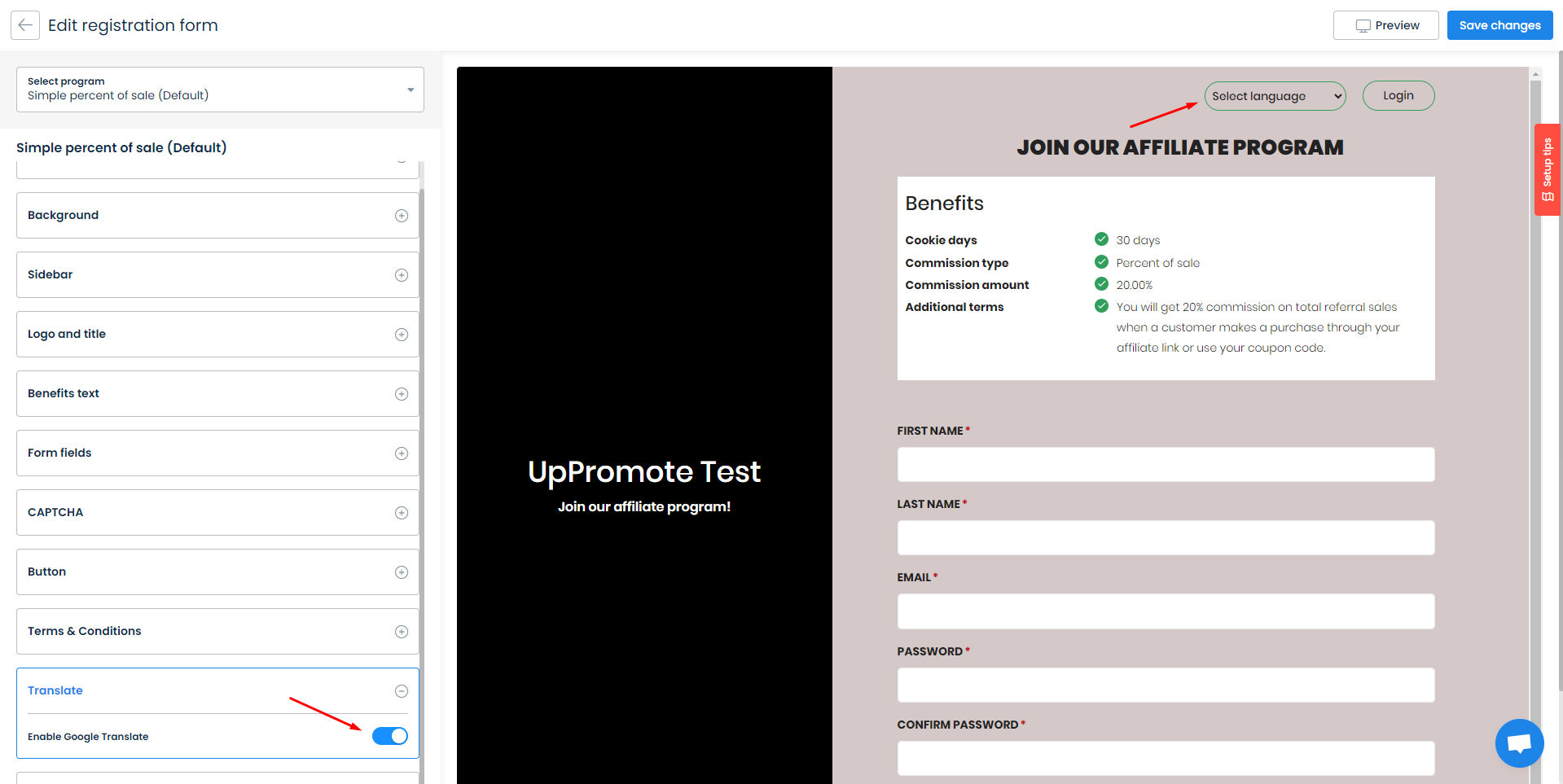 <mark style="color:red;">**UpPromote**</mark> has been getting more and more users from all over the world. Therefore, we have acknowledged the demand of having more languages available in the app. We use <mark style="color:blue;">**Google Translate**</mark> to add the option of translating the whole interface of the app and the registration form.